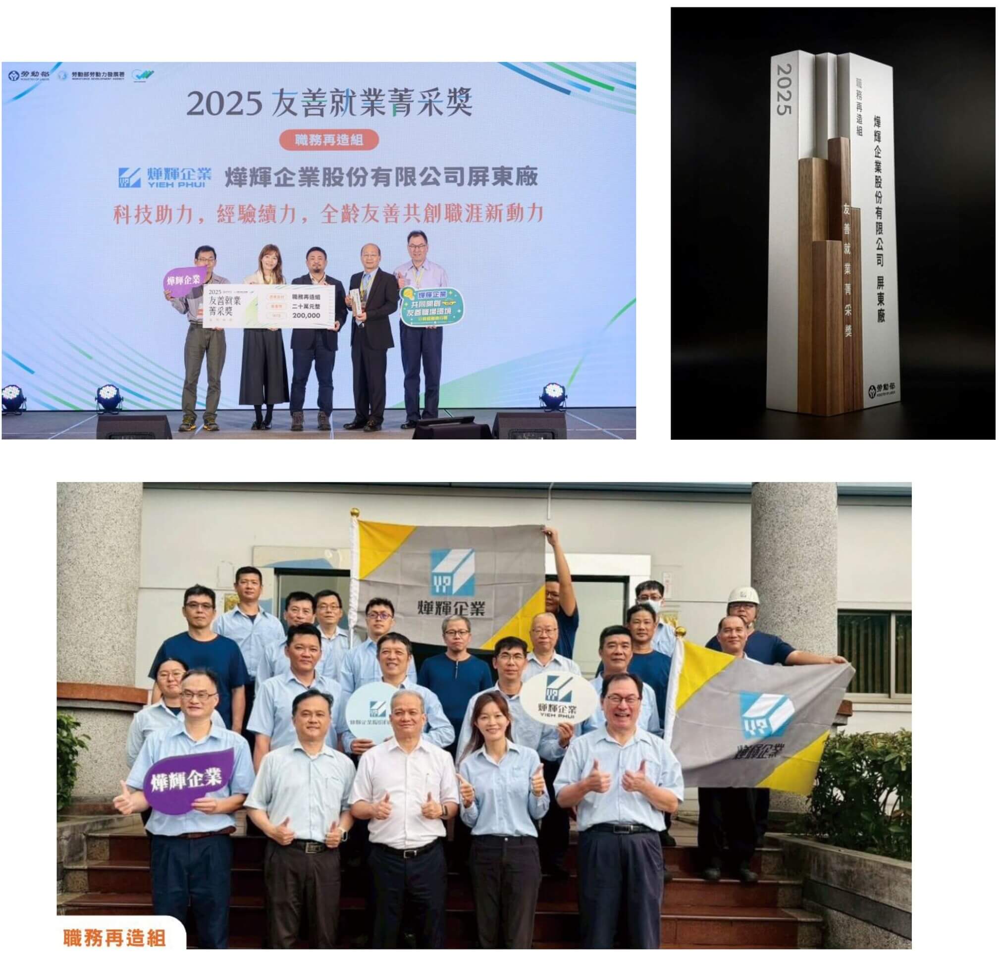 燁輝屏東生產部同仁集思廣益設計職務輔具,參加由勞動部勞動力發展署主辦,旨在維護中高齡及高齡者就業權益並表揚友善就業推動成果的「2025友善就業菁采獎」競賽,榮獲「職務再造組」優勝,並於2025年12月22日假台北市喜來登大飯店接受表揚。