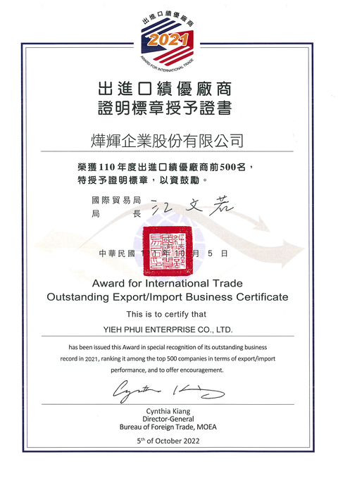 燁輝榮獲經濟部國際貿易局110年度出進口績優廠商排名前500名,獲頒「出進口績優廠商證明標章證書」。