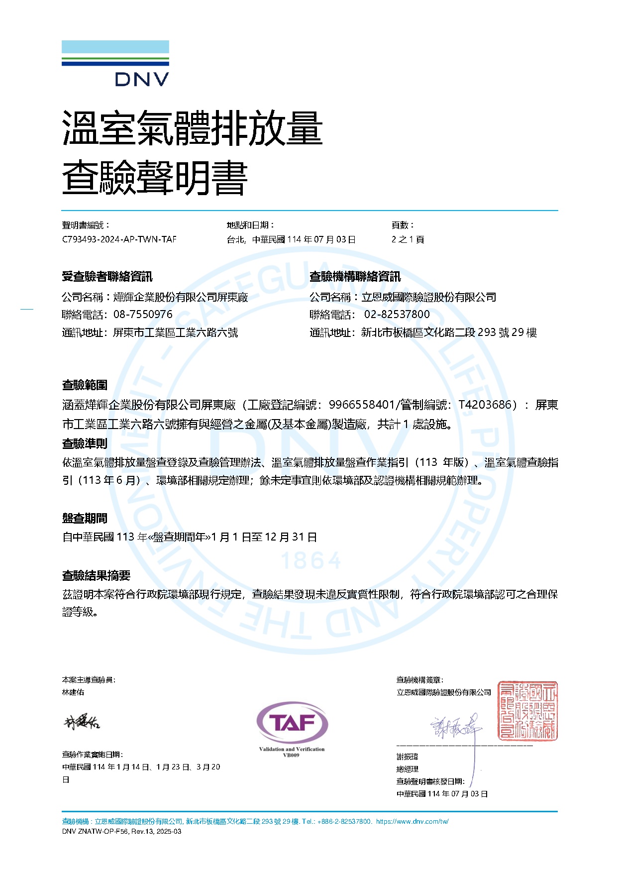 因應溫室氣體盤查暨申報管理辦法,高雄一廠(2014年)和屏東廠(2022年)依ISO 14064-1:2006環保署作業指引(類別1、2)進行查証並登錄環保署作業平台;因應金管會「上市櫃公司永續發展路徑圖」,燁輝企業全公司(高雄一廠、屏東廠、冷軋鋼板廠、機械廠、路竹廠、燕巢廠)自2022年起則委由第三方進行有限確信/查驗。